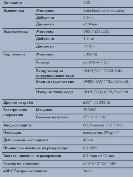 Вграден електрически нагревател 2 kW за всички размери. Увеличена повърхност на серпентината, благодарение на което е подходящ за използване в нискотемпературни отоплителни инсталации с термопомпи и кондензни котли.